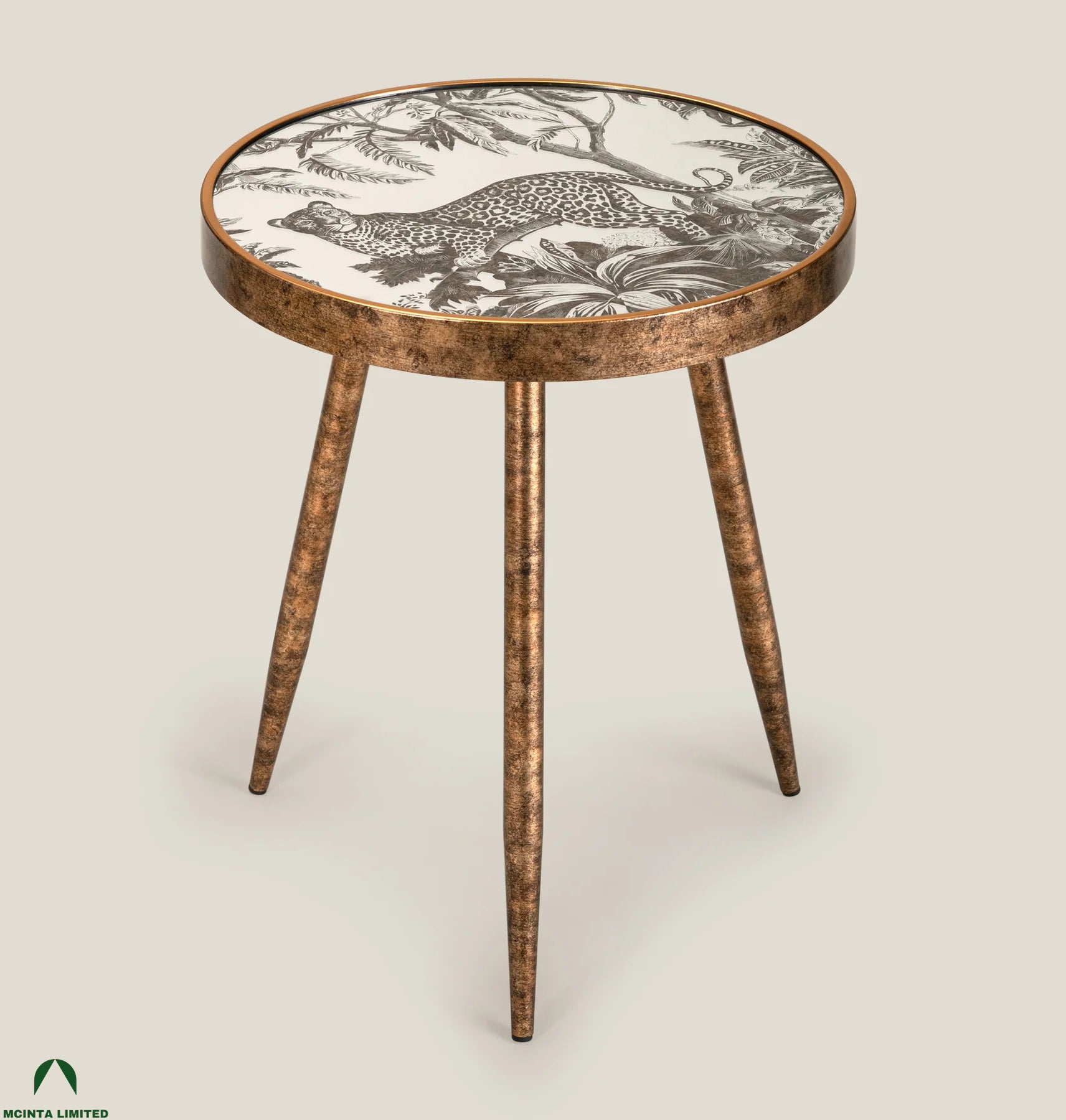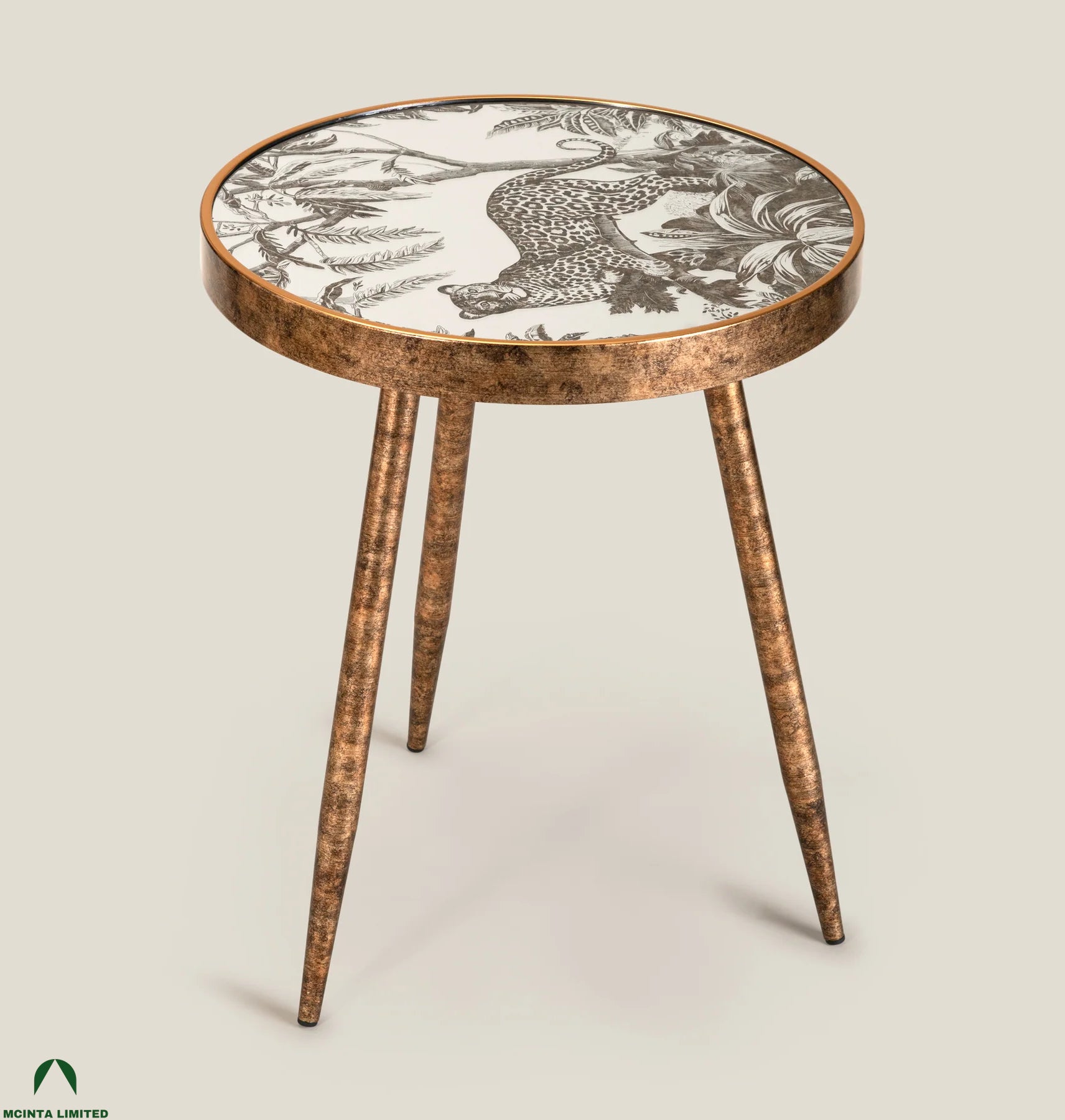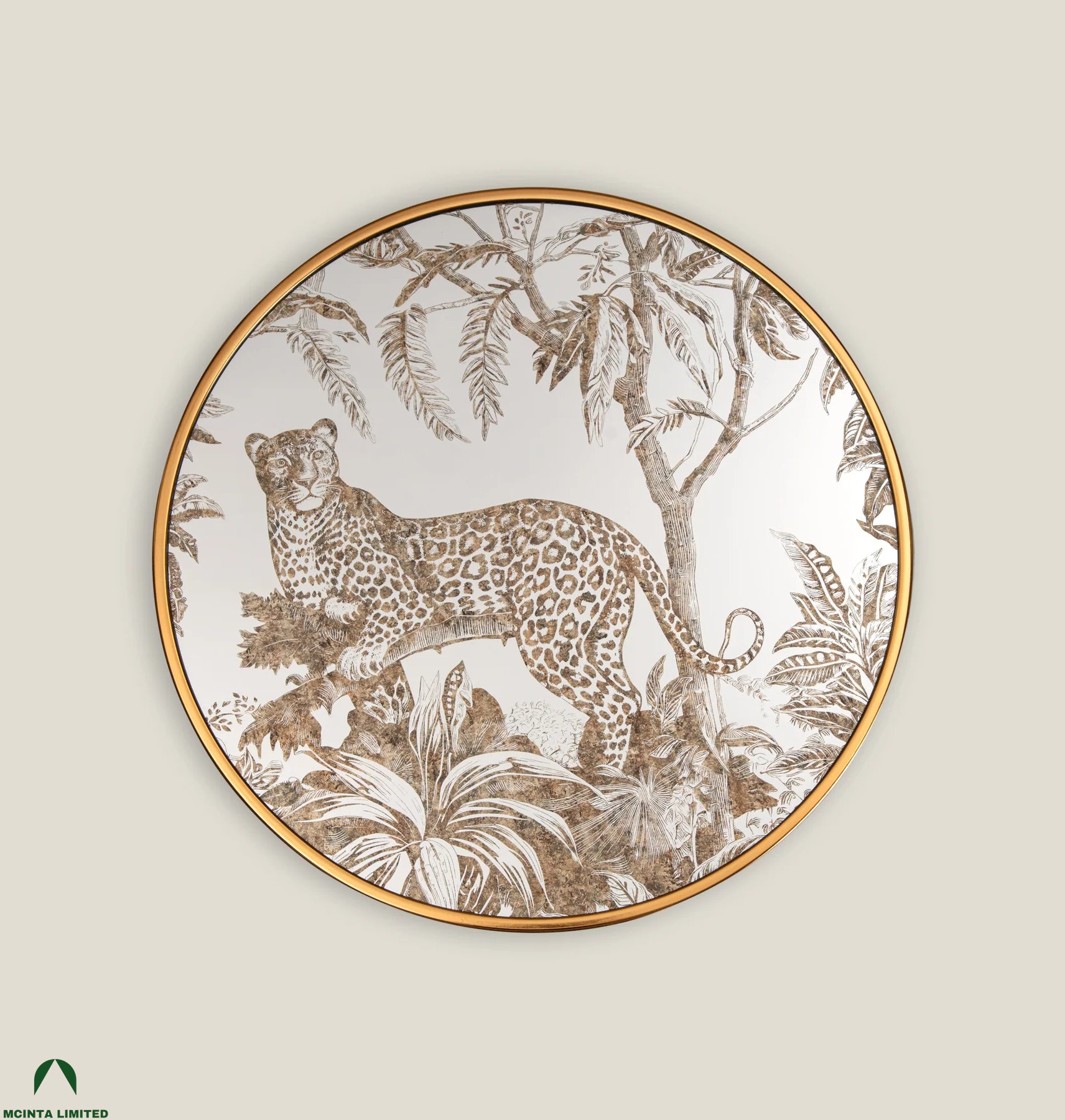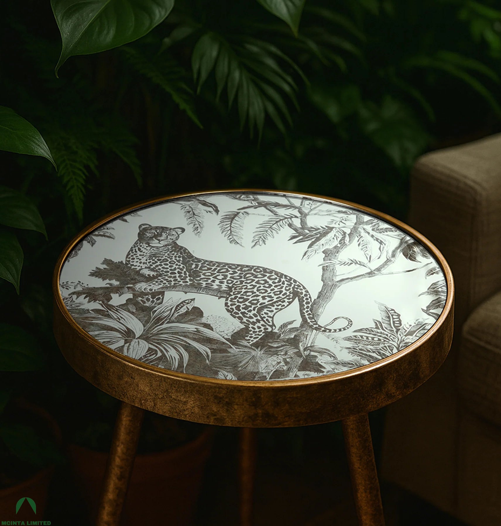 Our Botoni Leopard Print Side Table features mirrored glass with an intricate gold print and accented with vintage hand-painted or etched leopard prints, depicting a leopard nestled among tropical foliage. The clock's edges and legs also feature a gold finish. It creates an indelible, elegant impression wherever it's hung.