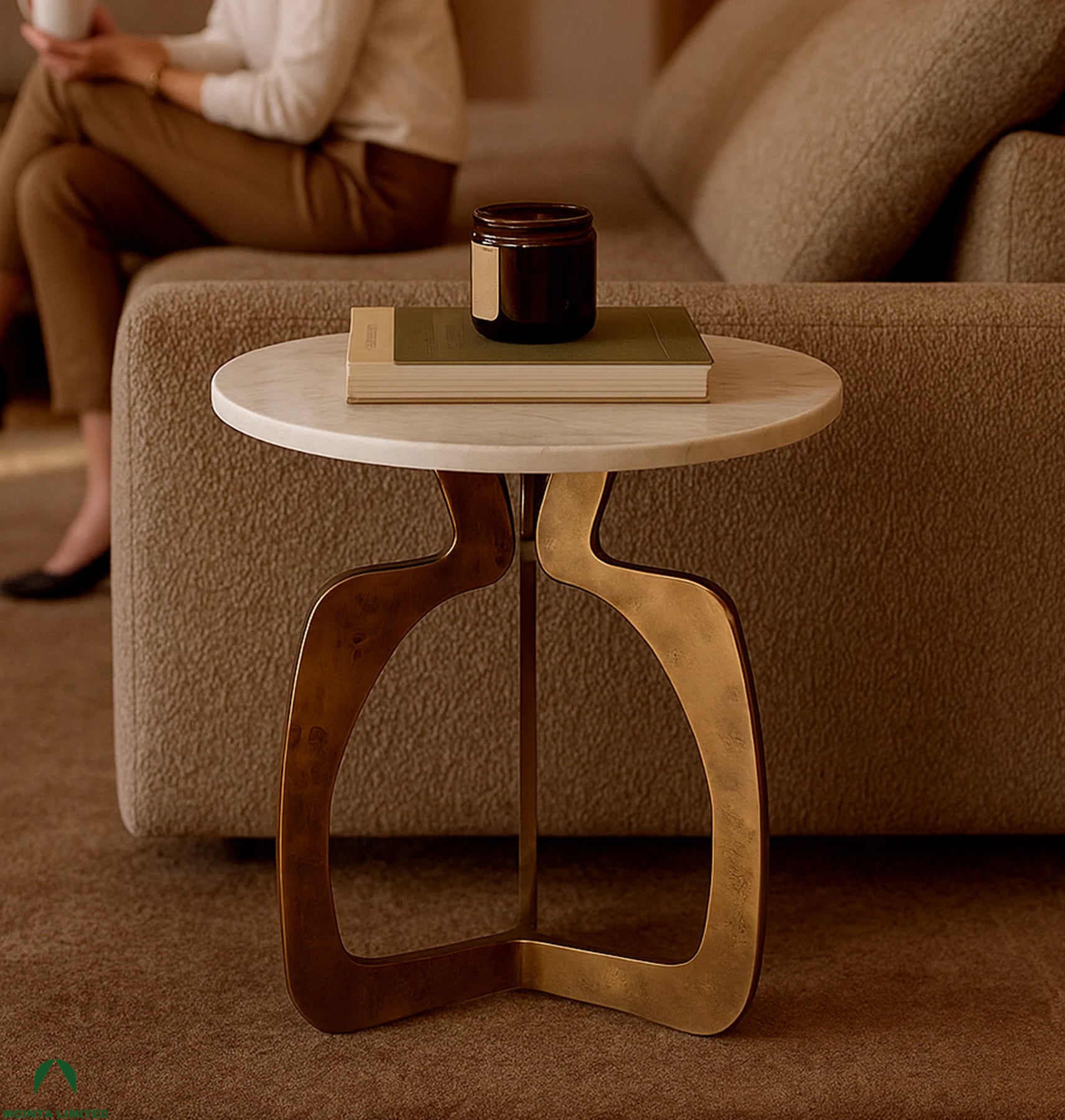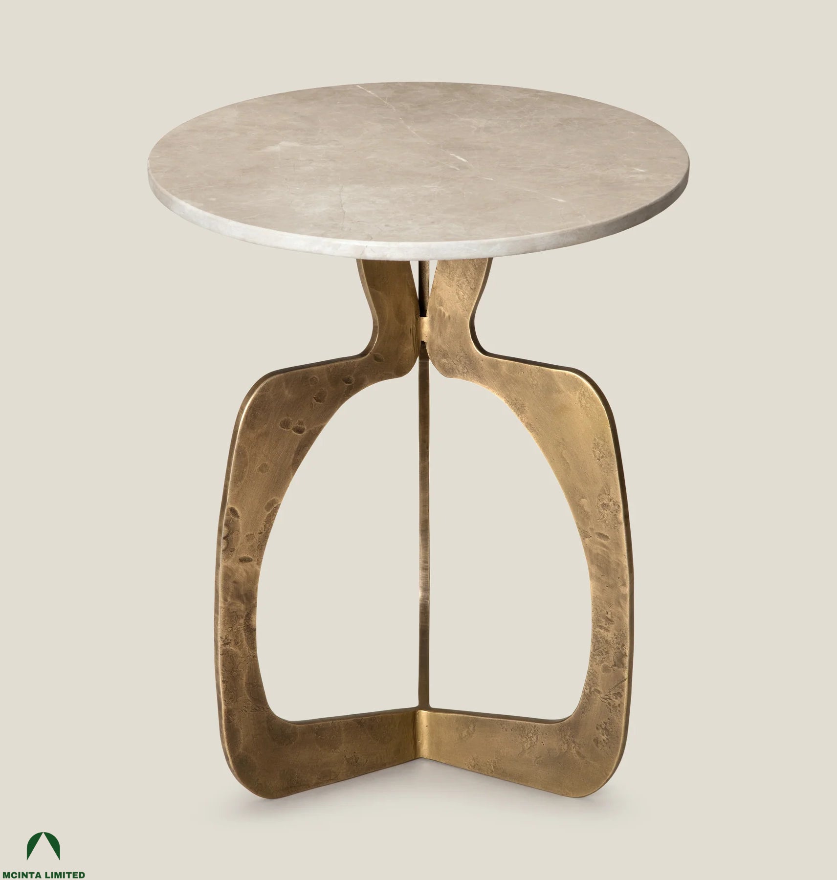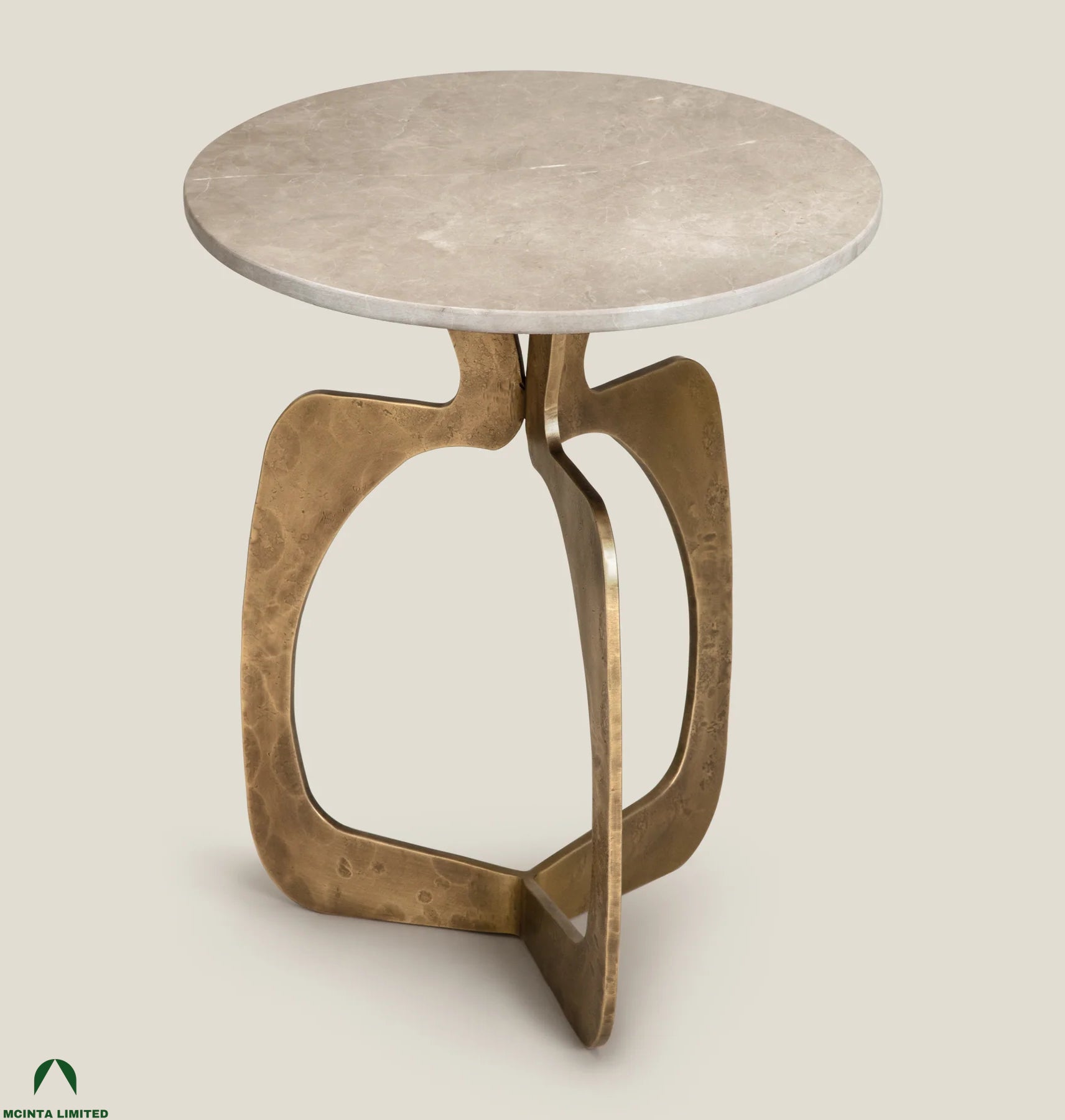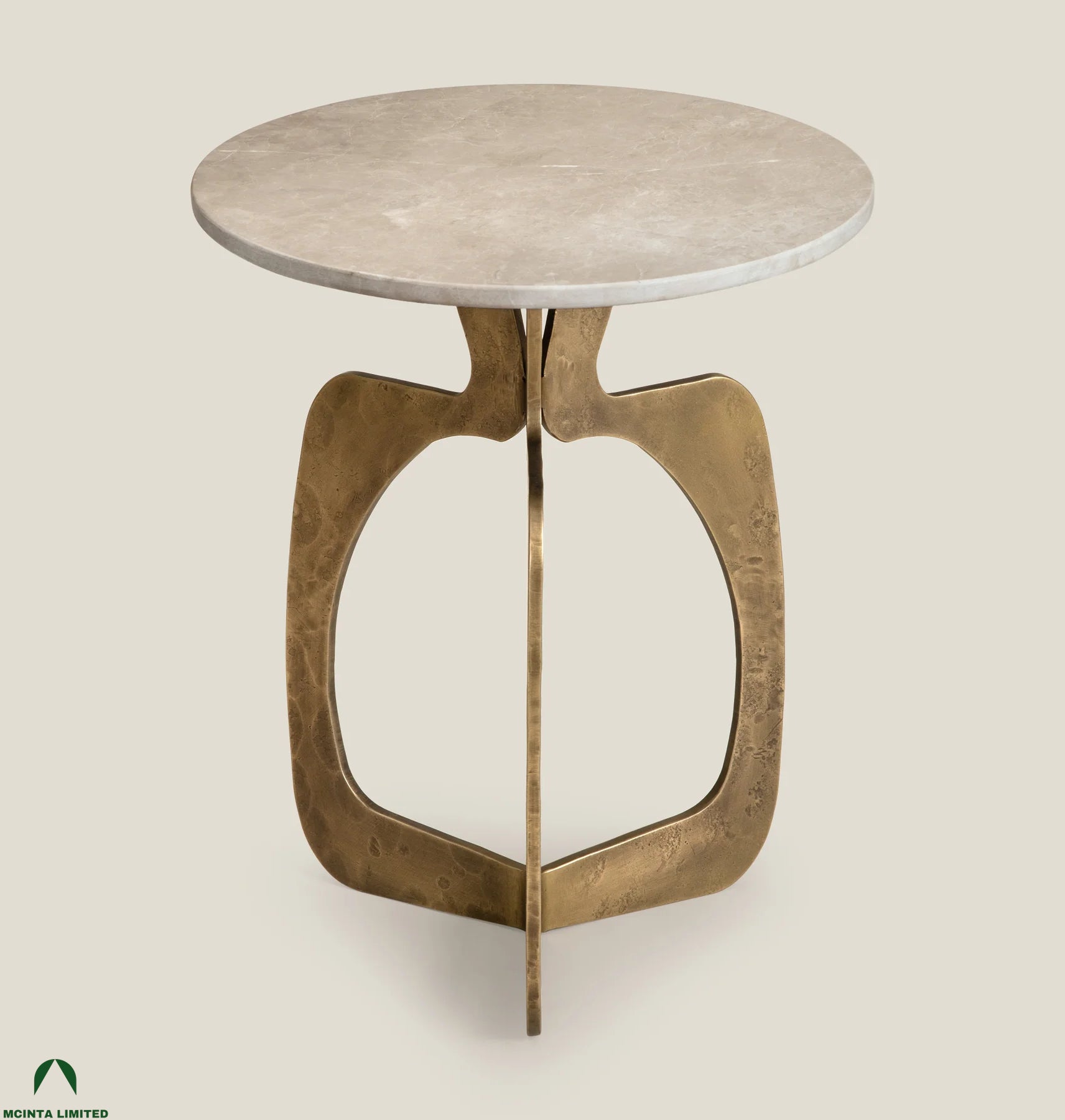 Our Case Marble and Metal Side Table perfectly blends modern elegance with artistic form. Its smooth beige marble top rests gracefully on a sculptural, hand-textured gold metal base, creating a perfect balance between luxury and modernity. Perfect as a decorative piece, its sophisticated design and timeless charm will enhance any space.
