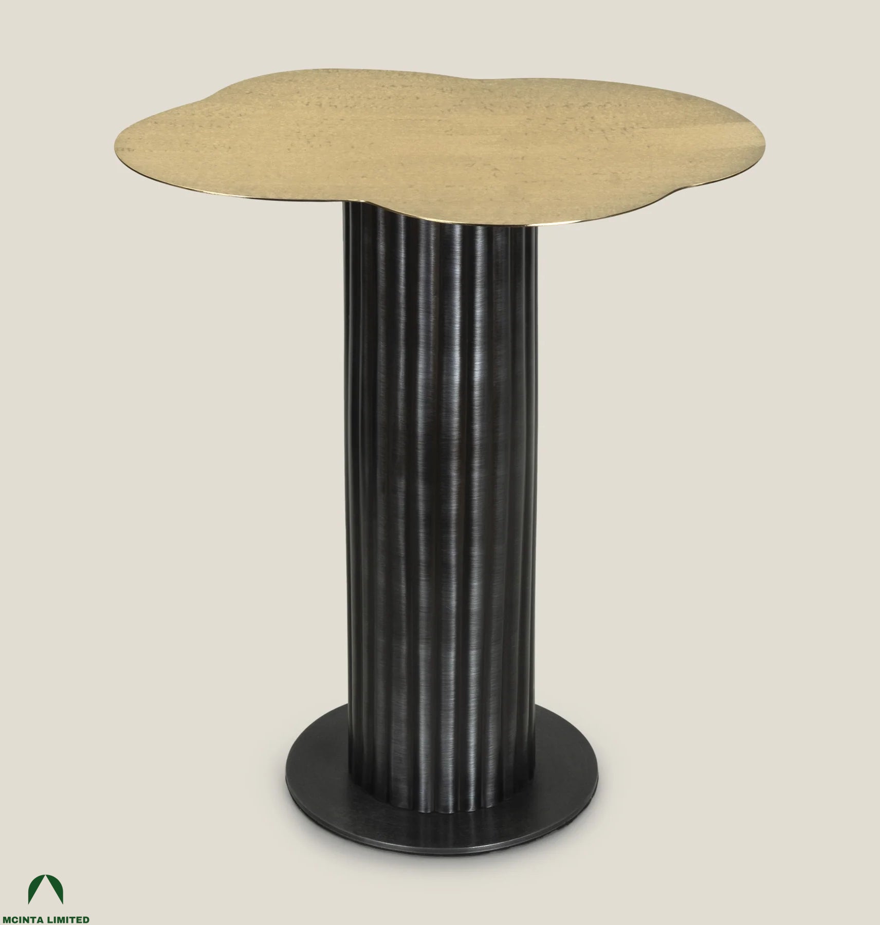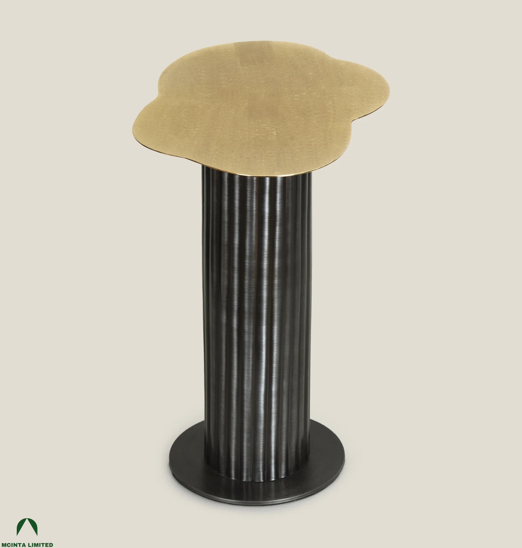This contemporary Maxine side table combines antique silver plating with thick, ribbed columns. The top is crafted from organically cut metal with a golden sheen. This iconic piece embodies the lavish lifestyle of Prague's high society.