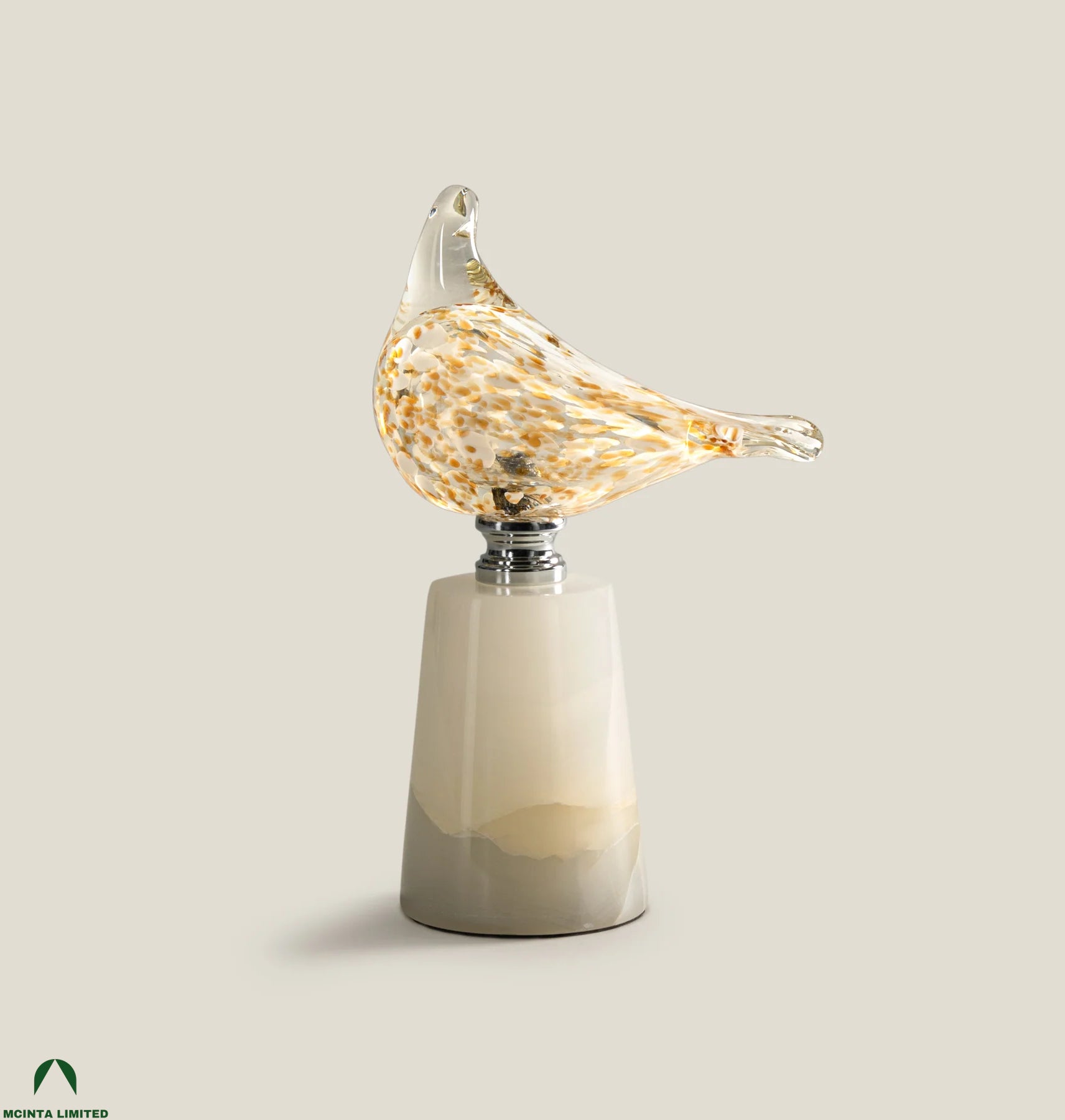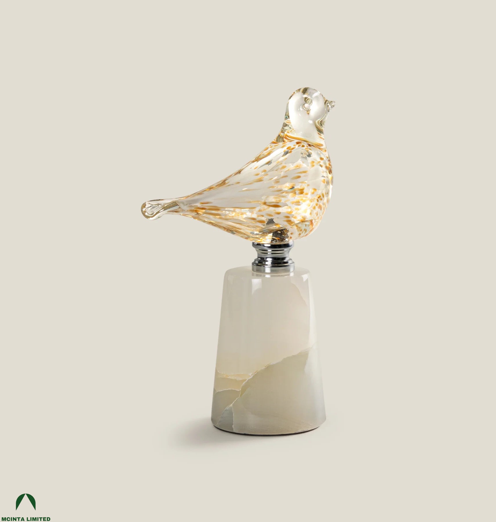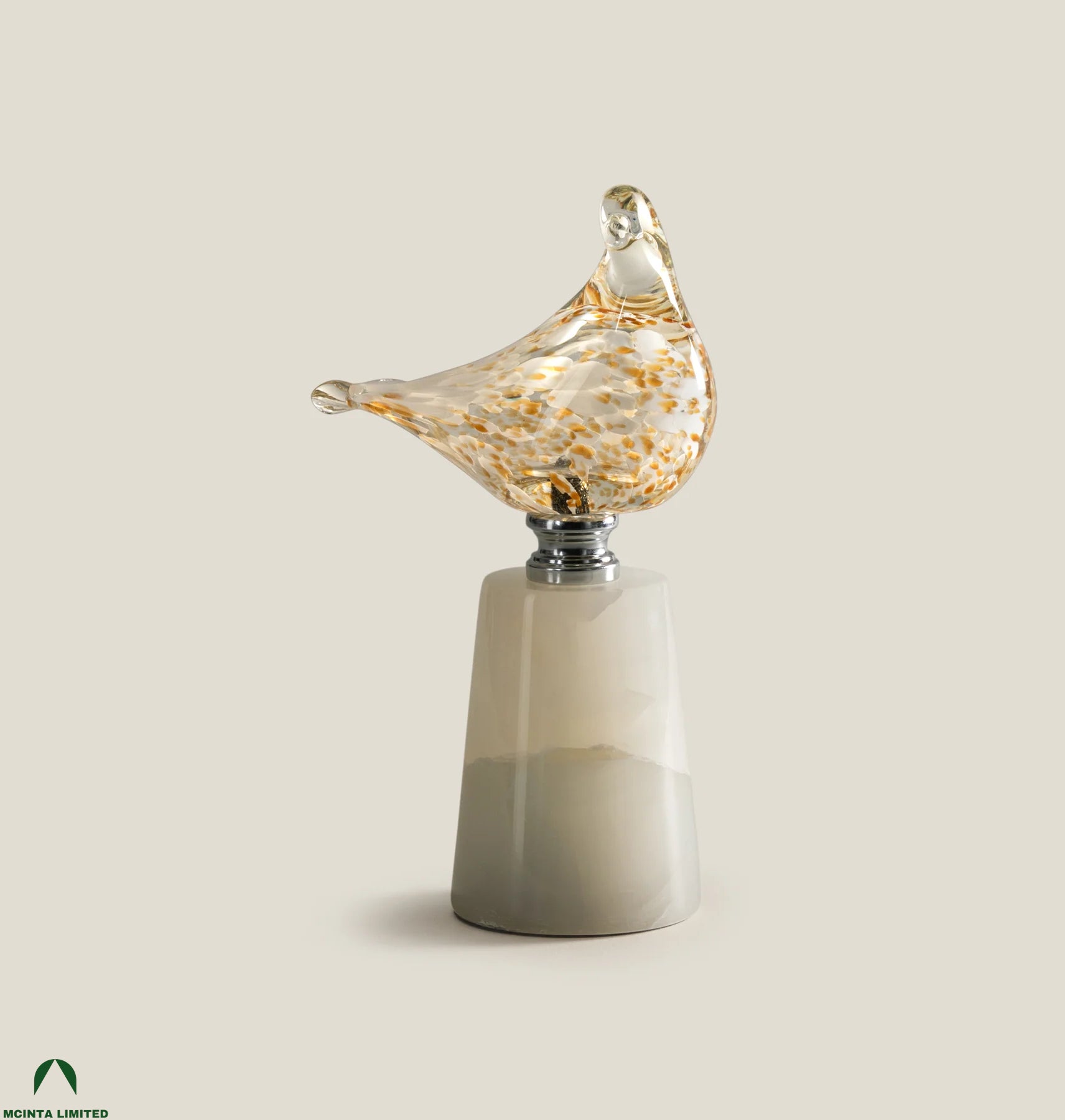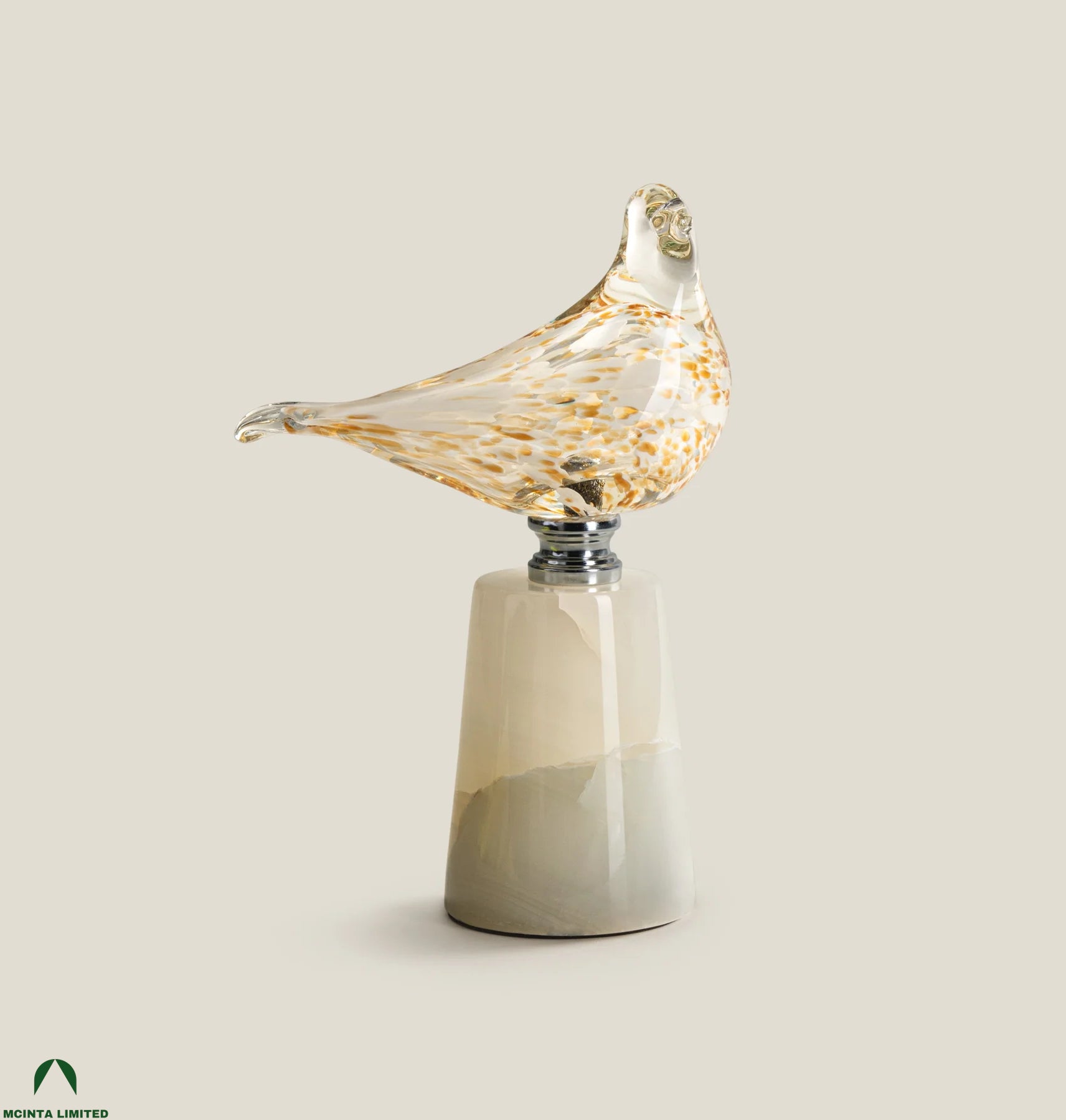 Our skylark sculpture exudes grace and brilliance, a masterpiece of refined artistry. Crafted from hand-blown glass, accented with warm gold, the lark gracefully perches on a smooth ivory base. A symbol of serenity and charm, this sculpture adds a touch of sophistication and whimsy to any mantel, countertop, or thoughtfully designed shelf.